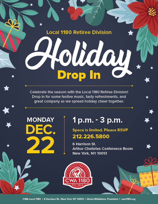 Celebrate the season with the Local 1180 Retiree Division! Drop in for some festive music, tasty refreshments, and great company as we spread holiday cheer together.