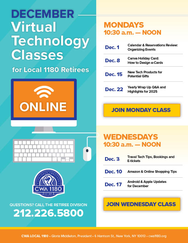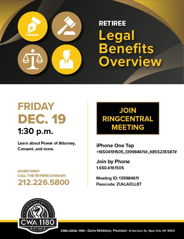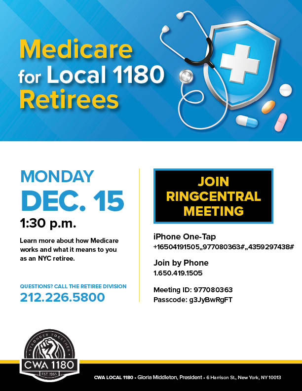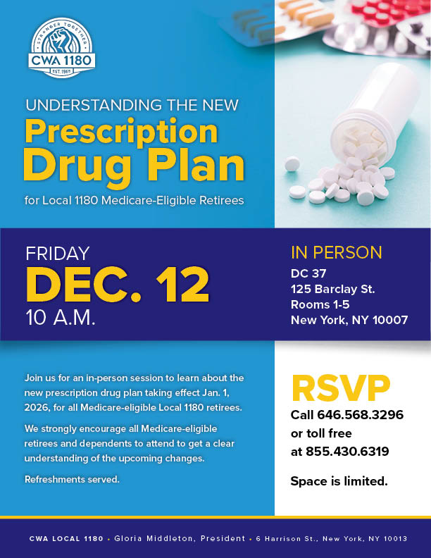 Join us for an in-person session on the new prescription drug plan taking effect Jan. 1, 2026, for all Medicare-eligible Local 1180 retirees. We encourage all eligible retirees and dependents to attend and get a clear understanding of the upcoming changes.