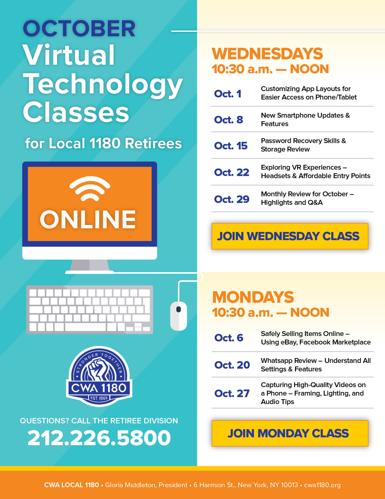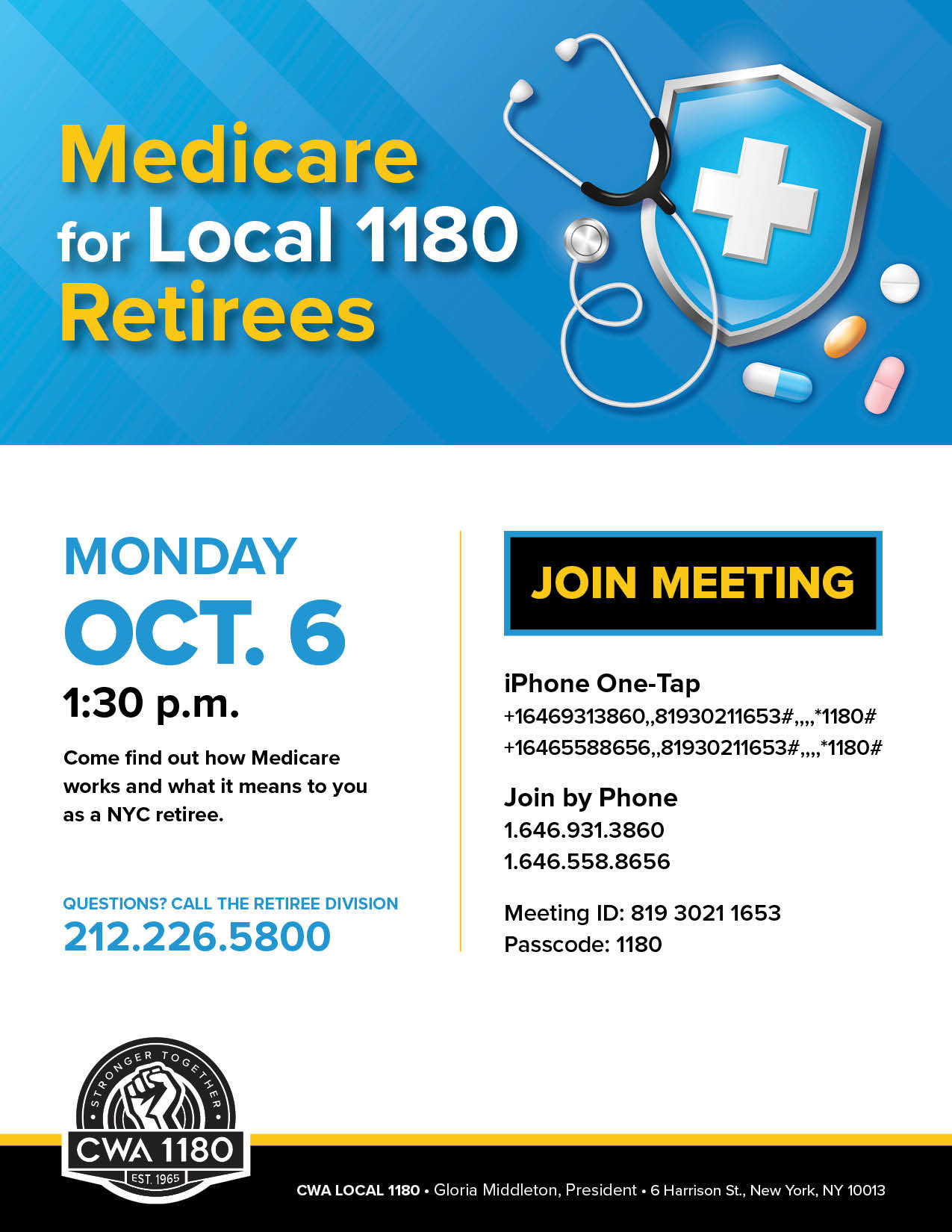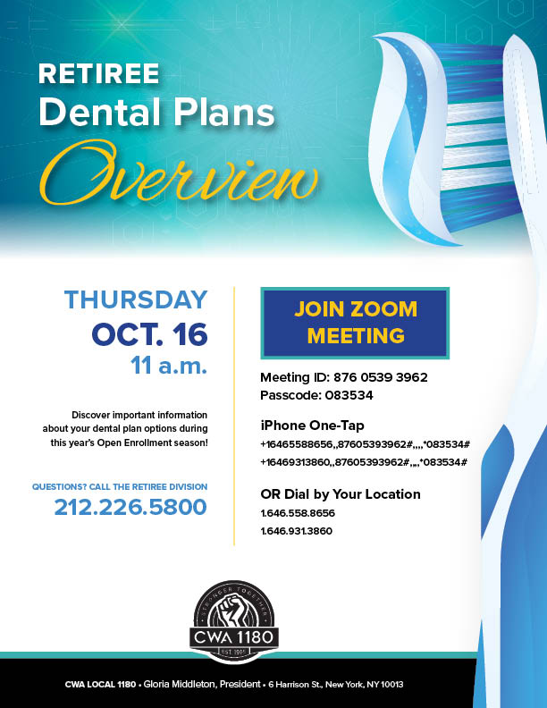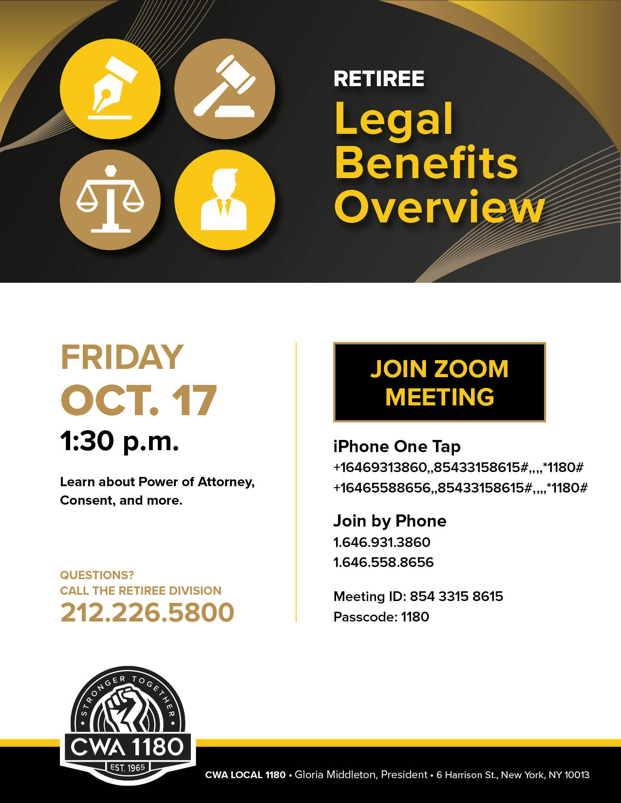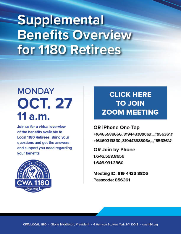 Join us for a virtual overview of the benefits available to Local 1180 Retirees. Bring your questions and get the answers and support you need regarding your benefits.
